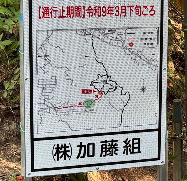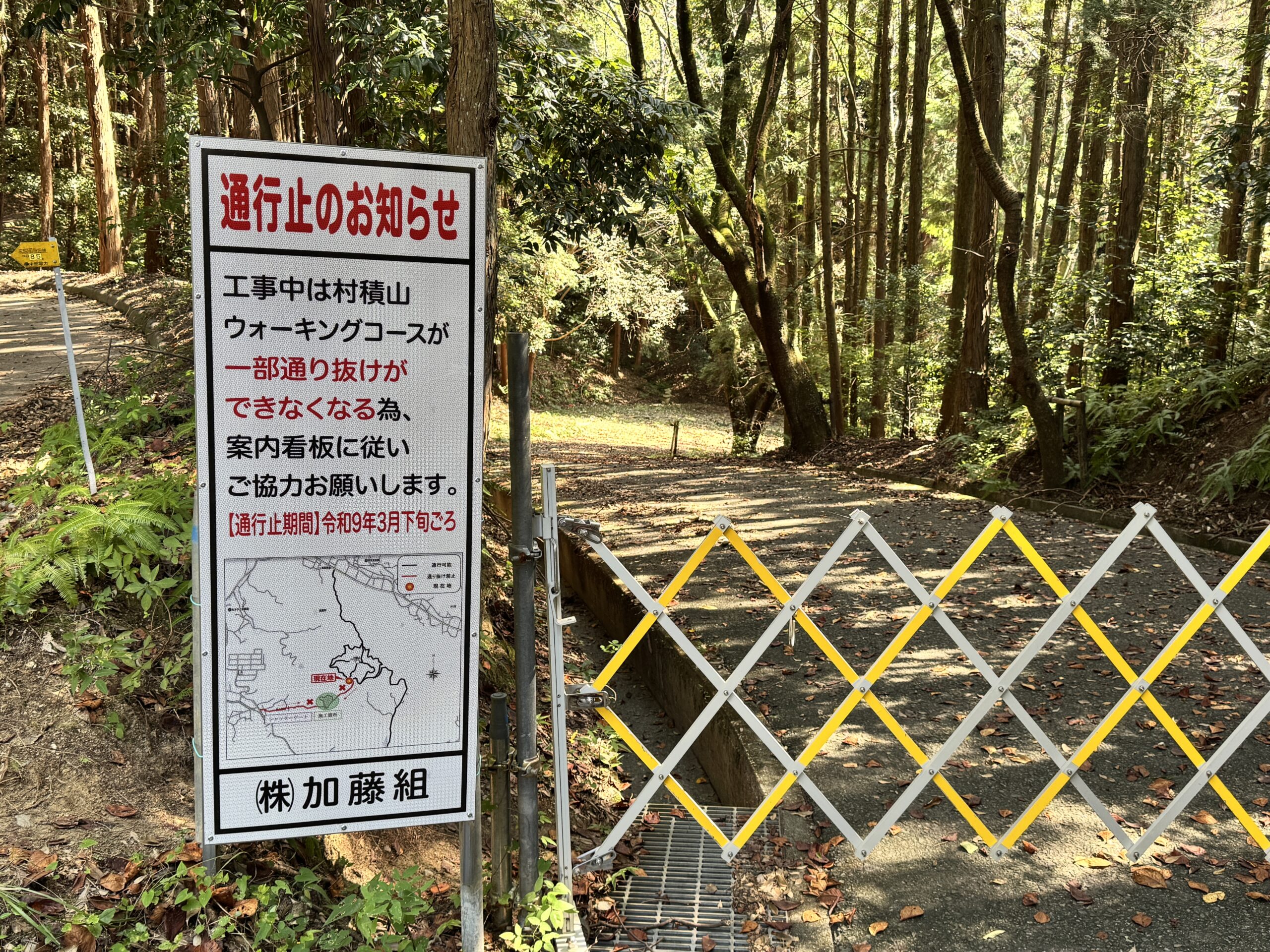 村積山の登山道一部通行止めについて お知らせ X Facebook はてブ Pocket LINE コピー 2025.10.10 村積山の登山道は、奥山田池改修工事のため一部通行止めになっています。通行止め区間は、奥山田登山口から山頂周回路分岐まで。村積山に登る際は、奥殿陣屋(熊野神社)、龍渓院方面からがメインになります。 当初、工事期間は令和7年9月12日までと案内がありましたが、その後工事期間が延び、現在では終了は令和9年3月下旬に変わっています。 右のフェンスがある道は、魚釣り池(奥山田池)、村積山神社里宮方面へ続き、左は山頂を周回する登山道です。